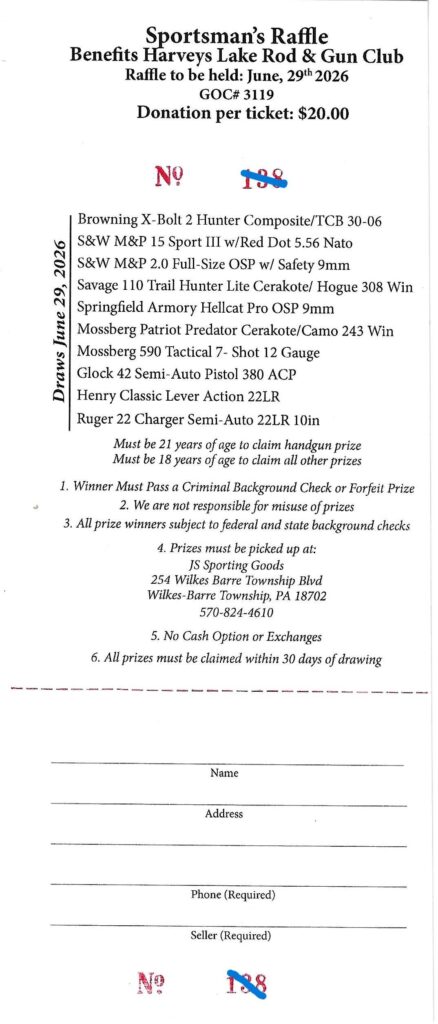 The raffle drawing will be held during the Members Meeting on June 29, 2026. Any member seeking additional raffle tickets to purchase or sell can pick them up at any Members Meeting or by contacting Denise, the Club Secretary, at 570-283-5428. Members who sell 20 or more tickets will receive a Workday/Clubhouse Cleaning (WD/CC) pass. The WD/CC pass may be submitted to be excused from any scheduled WD/CC.